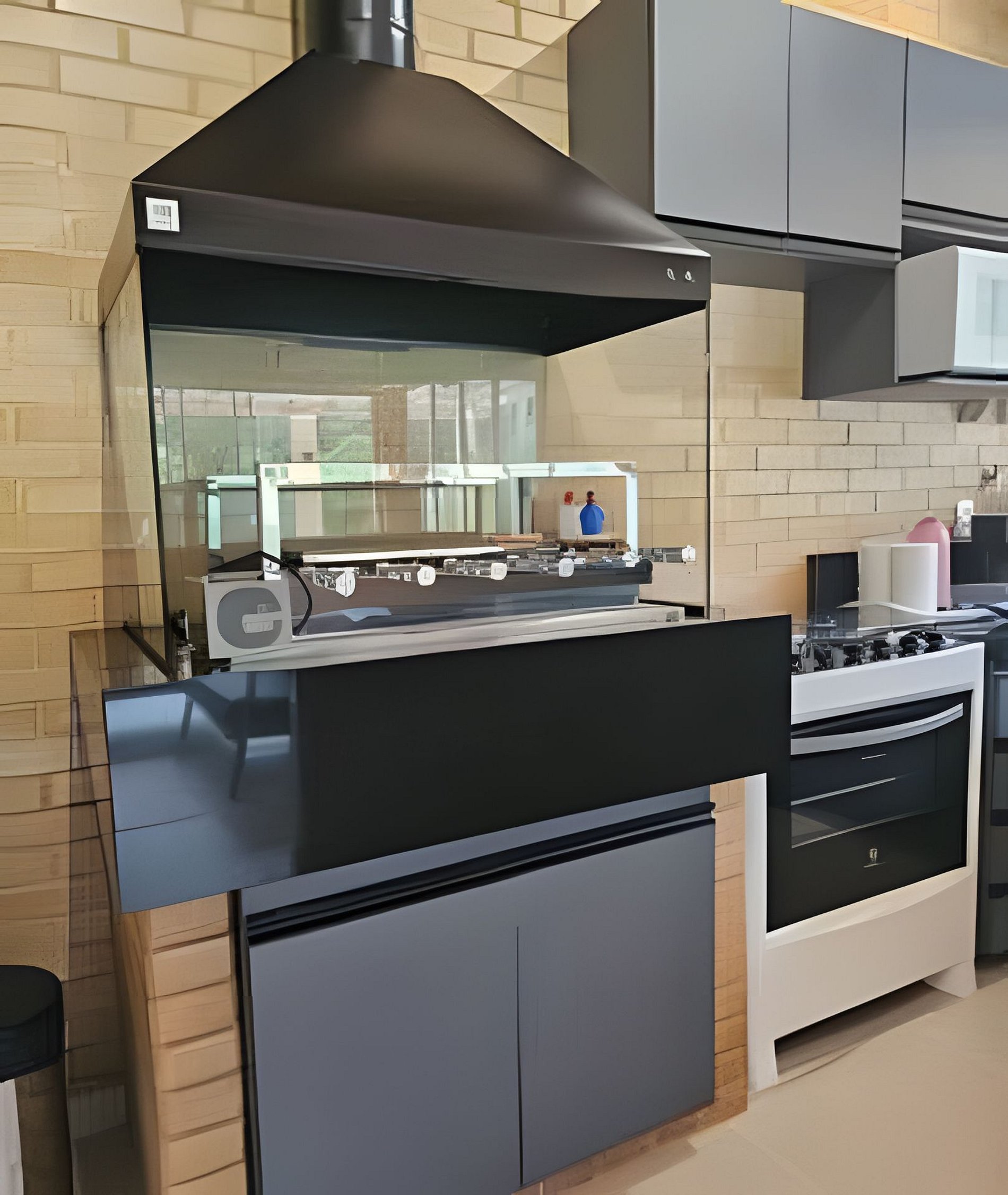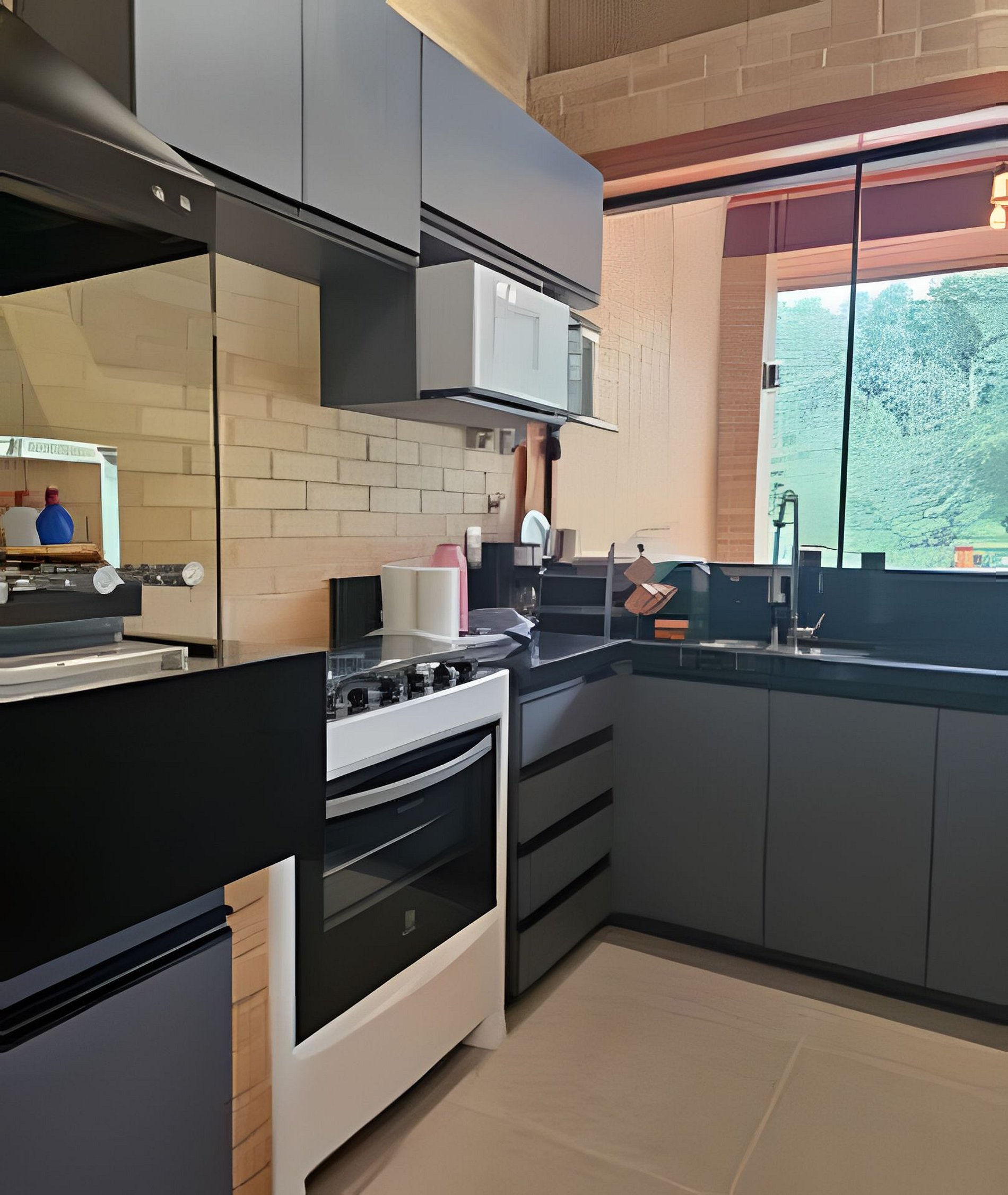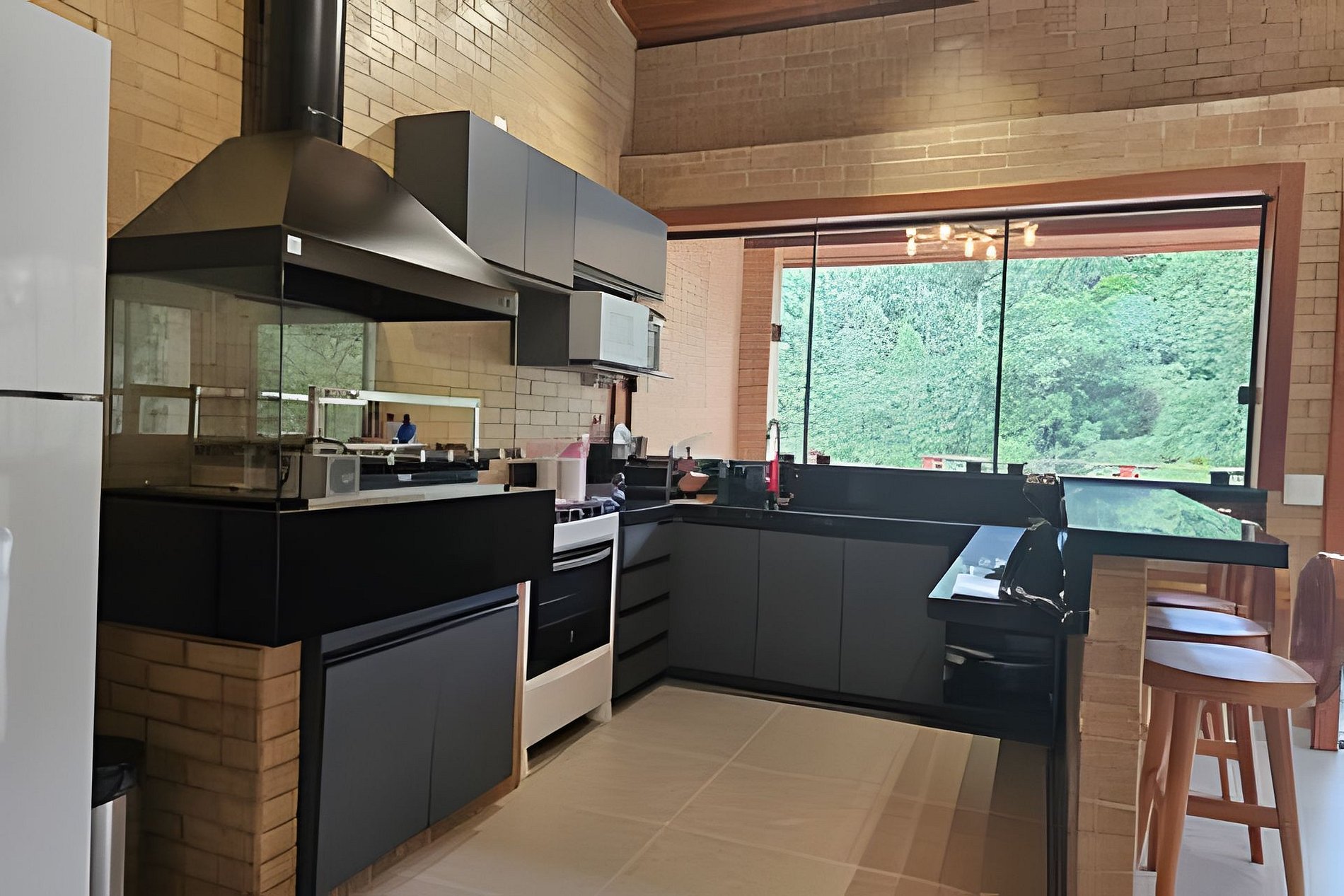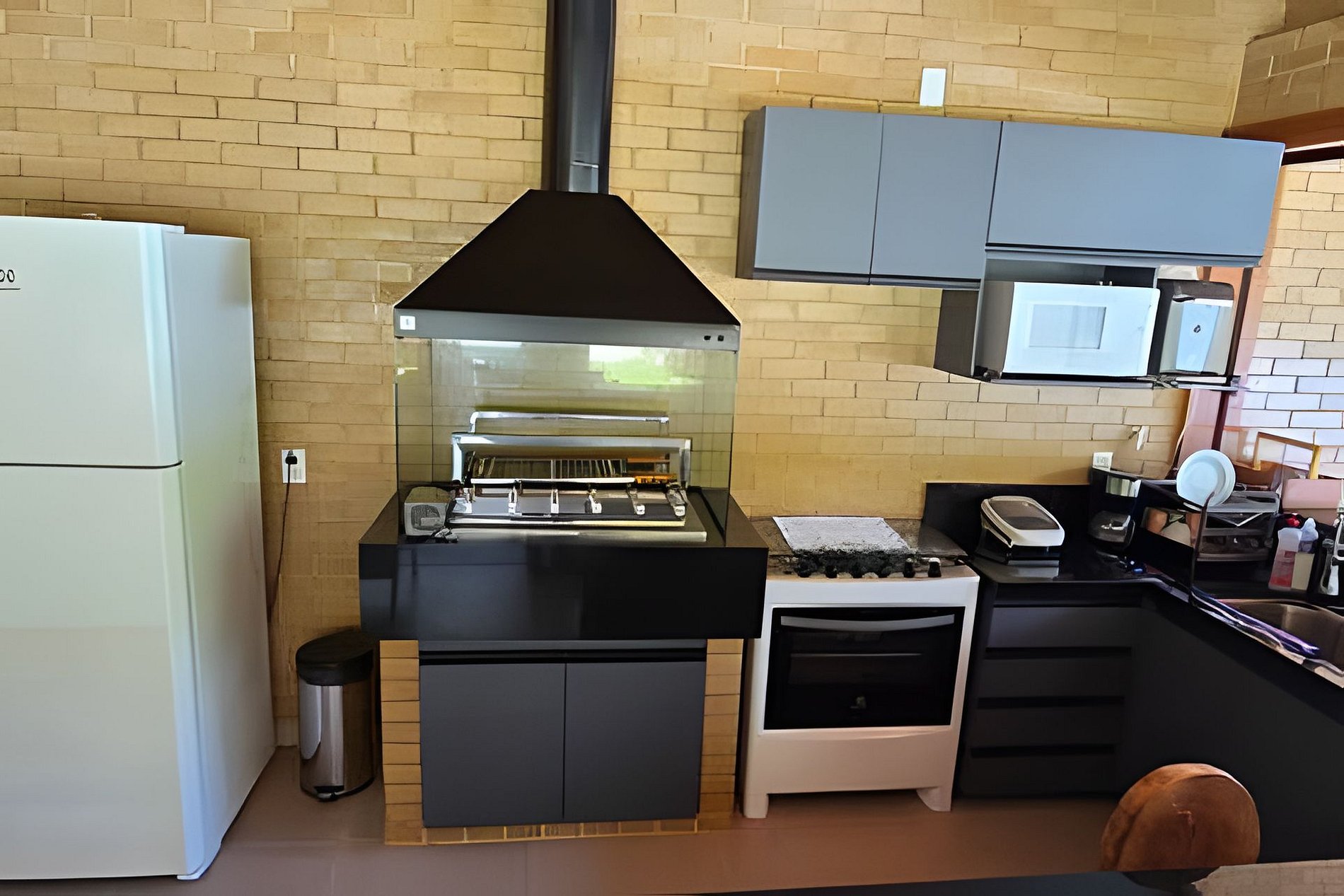 • Cozinha integrada com área gourmet: equipada com fogão, forno, geladeira, micro-ondas, filtro, utensílios diversos, churrasqueira, mesa espaçosa e bancada para momentos especiais.