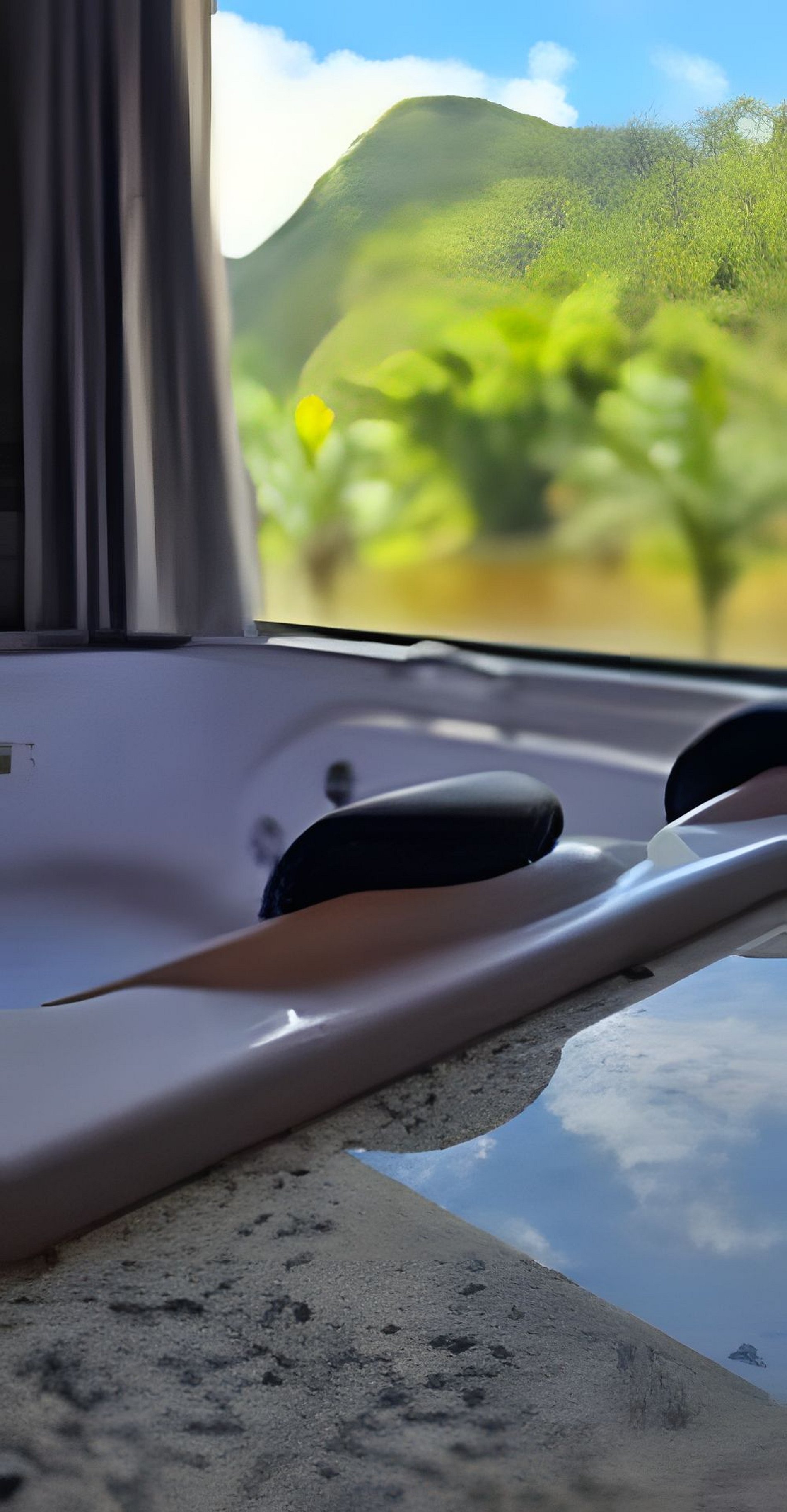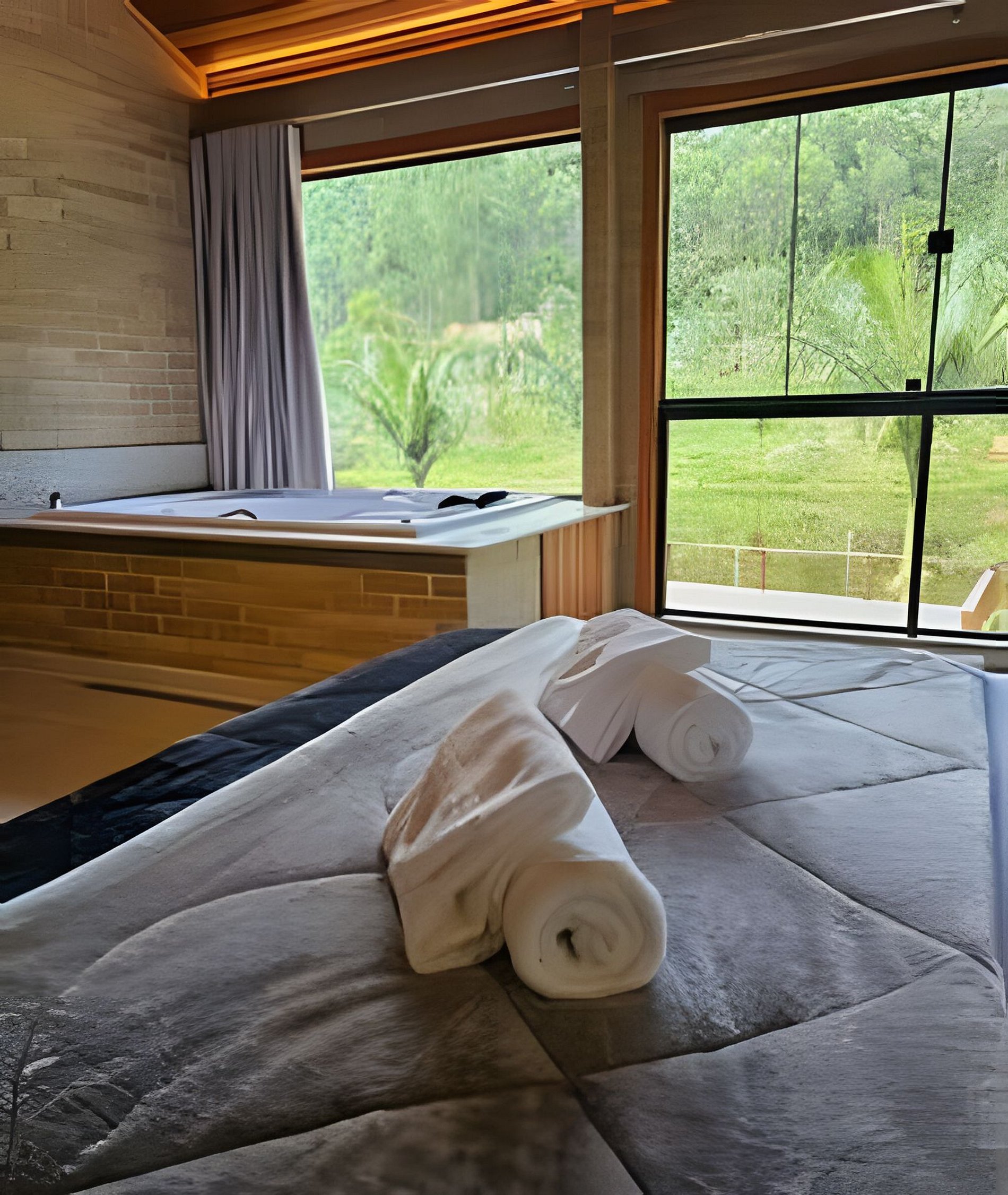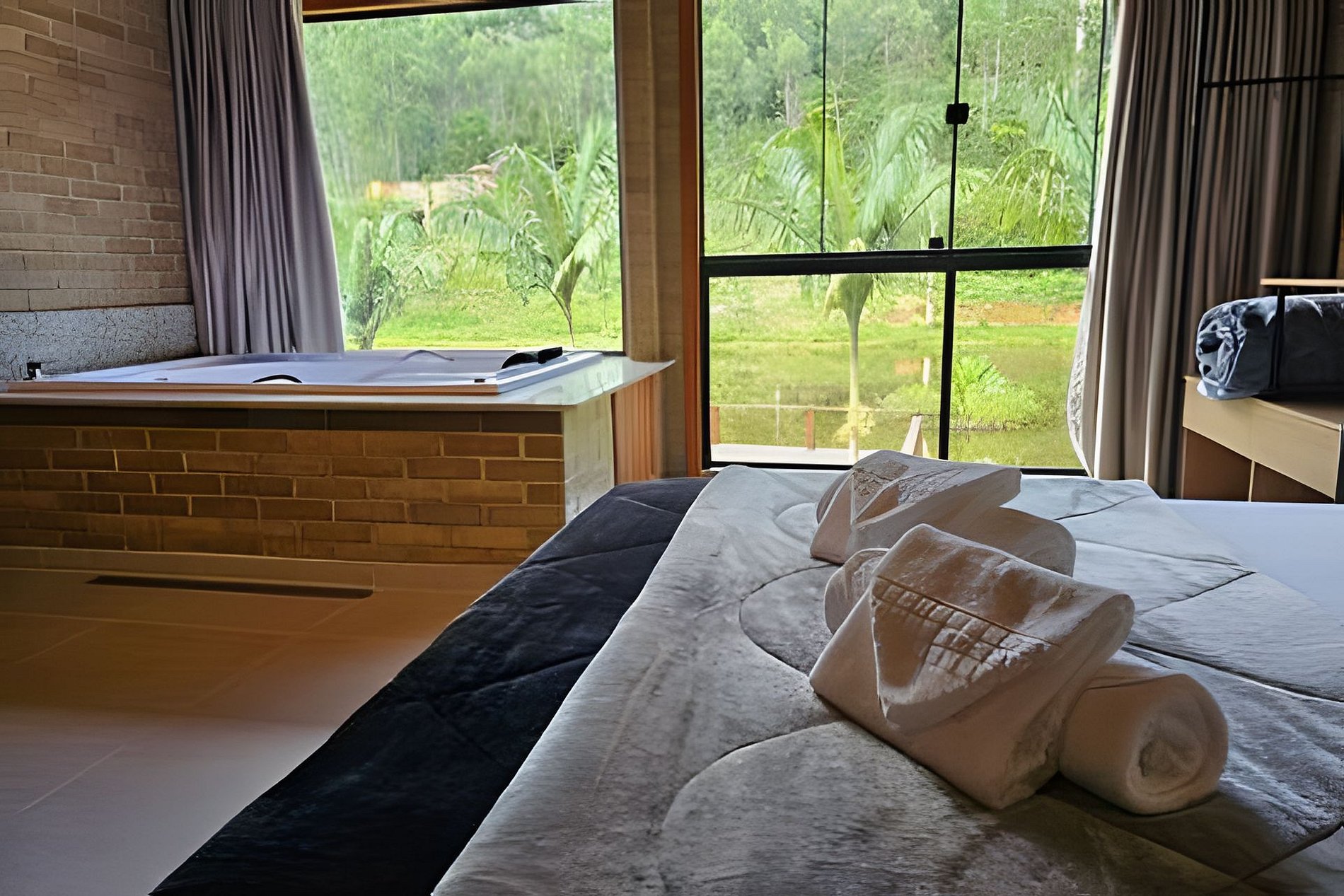 • Banheira no quarto com vista direta para a lagoa: relaxamento com paisagem única.