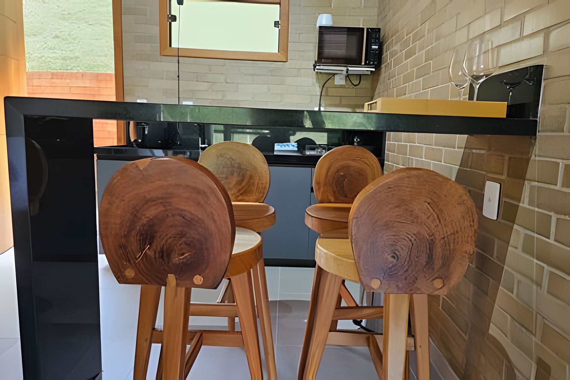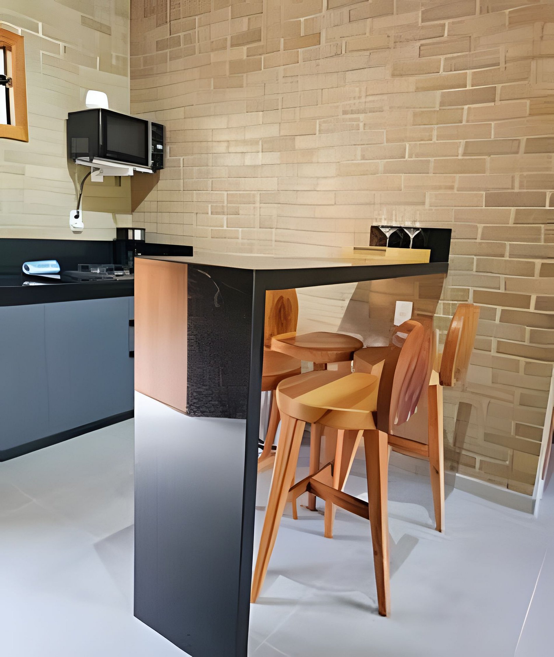 • Cozinha compacta: equipada com utensílios básicos e balcão para refeições rápidas.