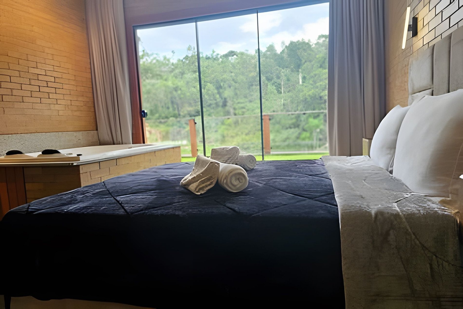• Banheira no quarto com vista direta para a lagoa: relaxamento com paisagem única.